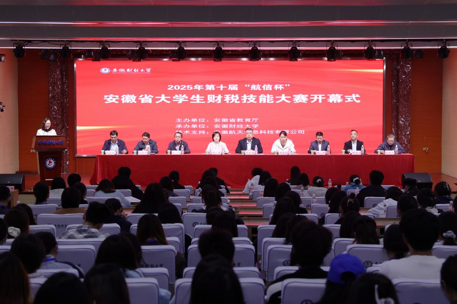 10月26日,由安徽省教育厅主办、安徽财经大学承办、安徽航天信息科技有限公司技术支持的第十届“航信杯”安徽省大学生财税技能大赛在我校隆重举行。来自合肥工业大学、安徽大学、安徽师范大学、安徽农业大学、安徽工业大学、安徽建筑大学等51所高校的99支参赛队伍参加本次大赛。我校党委常委、副校长孙小龙,安徽省教育厅大学生创新创业教育办公室秘书刘鑫蕊,国家税务总局安徽省税务局税收科学研究所所长刘艺,安徽省财政厅财政科学研究所副所长范勇,安徽航天信息科技有限公司党委副书记、常务副总经理(主持工作)周唐,蚌埠市财政局党组书记、局长林国立,蚌埠市政府副秘书长、营商环境局局长蓝佳勇,国家税务总局蚌埠市税务局党委委员、副局长张跃军,安徽财经大学教务处副处长舒家先,安徽大学经济学院财政系主任管治华,安徽省注册税务师协会秘书处主任朱枫,安徽财经大学财政与公共管理学院党委副书记汪芳芳出席开幕式。财政与公共管理学院院长杨晓妹主持开幕式。