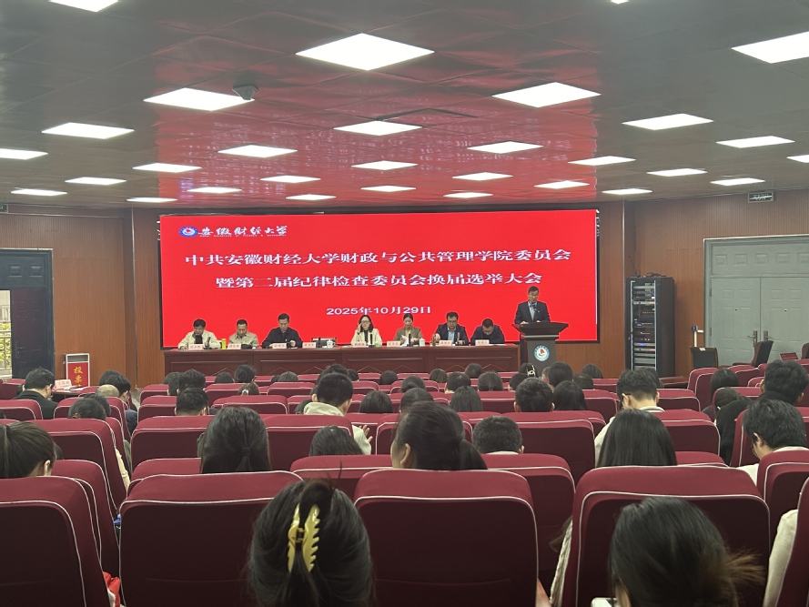 10月29日下午,中共安徽财经大学财政与公共管理学院委员会暨第二届纪律检查委员会换届选举大会在龙湖东校区博文楼二楼报告厅隆重举行。学院全体党员参加会议,大会由学院党委副书记汪芳芳主持。