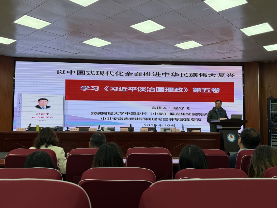10月29日下午,“学习《习近平谈治国理政》第五卷--以中国式现代化全面推进中华民族伟大复兴”宣讲报告会在博文楼二楼报告厅举行,中共安徽省委讲师团理论宣讲专家、安徽财经大学中国乡村(小岗)振兴研究院院长赵守飞老师作专题报告。学院领导班子、师生党员近150余人参加会议。
